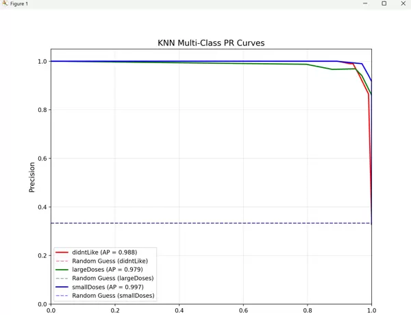 本实验完整实现了 KNN 算法在多分类场景下的应用,通过特征归一化、距离计算、投票机制、多指标评估和可视化,验证了 KNN 在约会数据集上的高性能。实验结果表明: