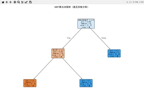 CART(分类回归树)是另一种常用的决策树算法,与 ID3 的核心区别在于: 采用基尼系数(而非信息熵)衡量节点纯度 始终进行二分分裂(即使多分类特征也拆分为 "是 / 否" 两组)