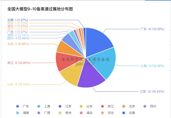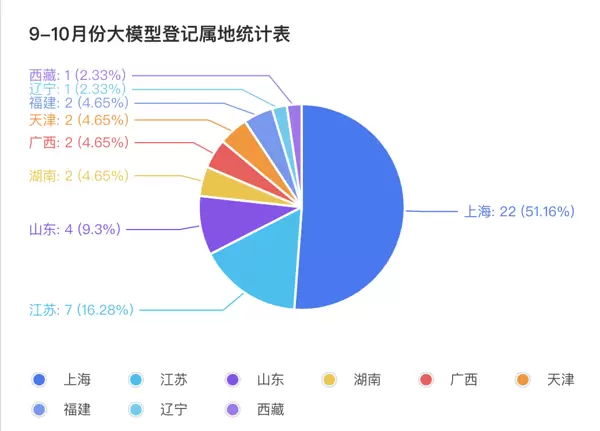 观察结论:长三角(沪苏浙)+珠三角(广东)构成了核心集聚区,合计占比达到65.8%。北京虽仅备案了5款模型,但多为领先企业(如小米、奔驰中国、红杉天枰),具有较高的技术含量与示范效应。山东异军突起,以9款位列第四,显示出其在工业互联网、医疗健康、传媒等垂直领域的AI布局加速。