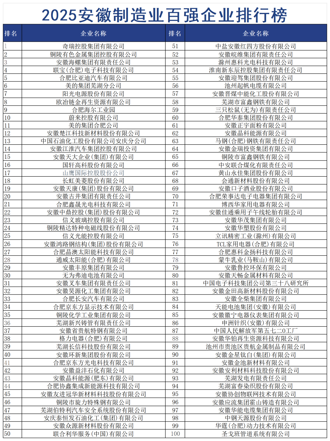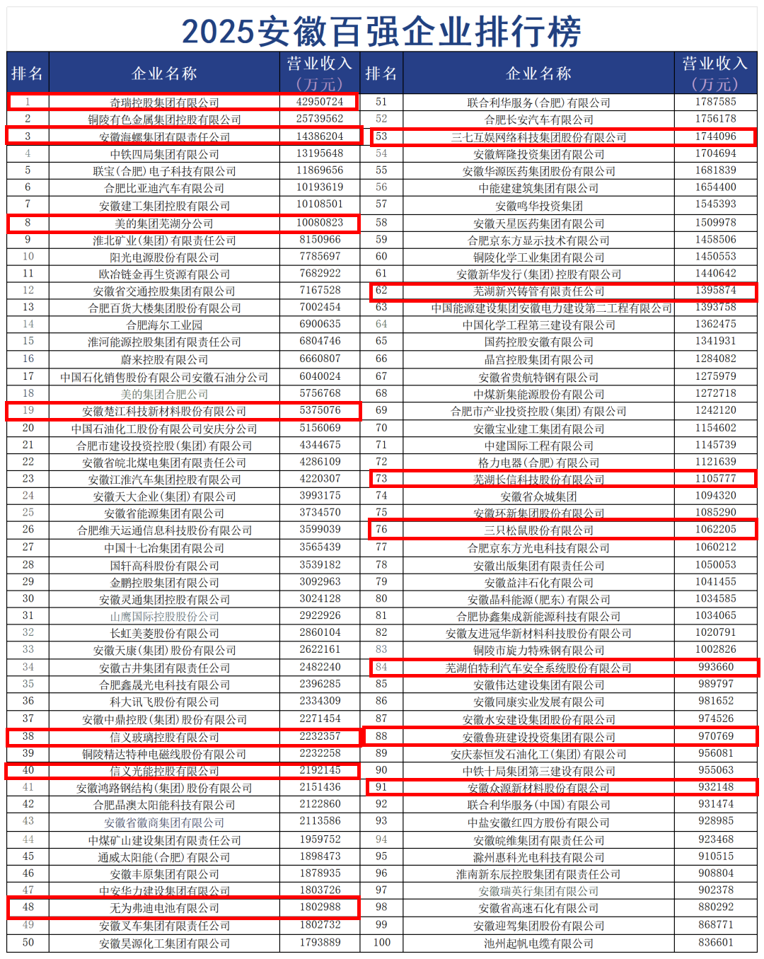 在2025安徽百强企业榜单中,芜湖入围企业13家,比上年增加3家,入围企业数量位居全省第二。其中,奇瑞控股集团有限公司以近4300亿元的营业收入位列榜单第一位,安徽海螺集团有限公司位列第三位,美的集团芜湖分公司位列第八位。