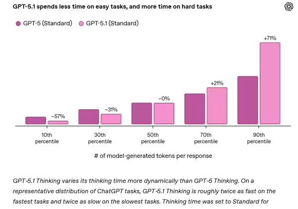 - GPT-5.1 Thinking:注重高级推理能力,能够根据任务复杂度自适应“思考时间”——对简单任务反应迅速,对复杂任务则进行更深入持久的分析。