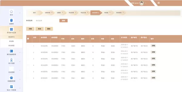 词汇学习记录(管理端):可查看用户词汇学习的详尽信息,包括词汇名称、类别、学习时间等,支持搜索、详情、修改、删除操作。