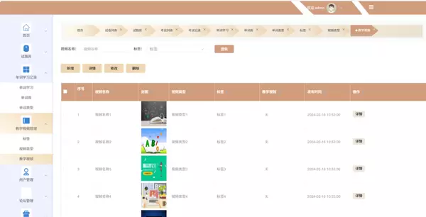 教学视频管理(管理端):支持教学视频的新增、详情、修改、删除及按名称、标签搜索。