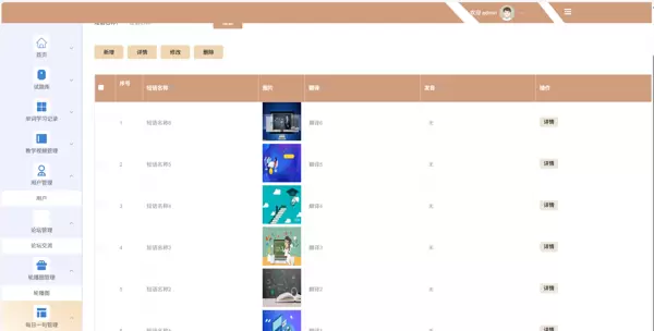 每日一句管理(管理端):管理每日一句的短语资源,包括新增、详情、修改、删除及搜索。