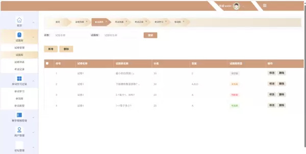 试题库(管理端):支持试卷和试题库的搜索、新增、删除及试题的修改删除等管理操作。