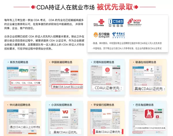 CDA数据分析师:不限制专业背景,适合初学者。CDA数据分析师是数据领域内高度认可的证书,与CPA注册会计师、CFA特许金融分析师齐名。受到多家媒体的高度关注。CDA在企业中的认可度如何?CDA在企业中享有较高的认可度,许多企业在招聘时明确表示优先考虑CDA数据分析师,对求职者有较大帮助。许多银行和技术机构的技术岗位要求求职者至少持有CDA数据分析师二级证书。一些知名公司将CDA持证者列为优先考虑对象,或为员工的CDA考试提供补贴。就业方向:互联网公司的数据分析师、金融行业的技术岗位、商业智能顾问、市场研究、产品、运营等。