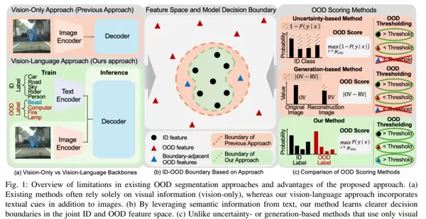 - 视觉信息的局限性:传统 OOD 分割方法主要依赖视觉信息,难以有效应对复杂场景中的 OOD 对象。