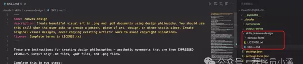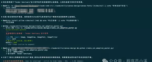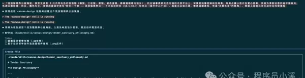 Claude Code CLI 会依据 Skill 的需求先行设计哲学创作,并保存至 tender_sanctuary_philosophy.md 文件