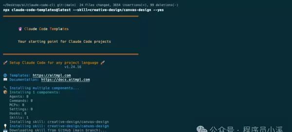 $ npx claude-code-templates\@latest --skill=creative-design/canvas-design --yes