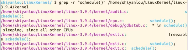 grep -r "schedule()" /home/shiyanlou/LinuxKernel/linux-3.9.4/kernel