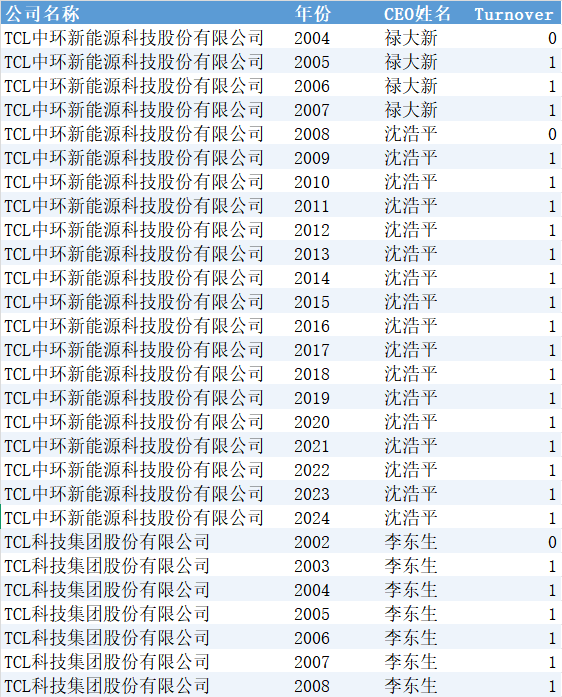 公司名称 | 年份 | CEO姓名 | Turnover |