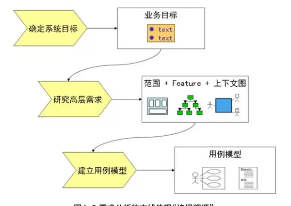 系统目标 → 高层需求(范围框图+Feature树+上下文图) → 用例模型(用例图+用例规约)