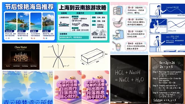 Seedream 4.0 引入了加强的文本渲染功能,不仅限于简单的展示,而是服务于实际用途。通过智能理解与扩展及高精度密集文本渲染能力,它支持多种复杂的文本与图形生成任务,包括设计用户界面、海报或示意图的布局,以及生成知识密集型的可视化内容,例如数学公式、化学方程式或统计图表,如图14所示。这些功能使该模型能够直接生成教育资料、技术手册或营销内容。此外,Seedream 4.0 还支持精准的文本感知编辑,包括内容替换、布局调整和字体修改,从而将其渲染能力扩展到实际工作流中,为工作相关的场景提供支持。