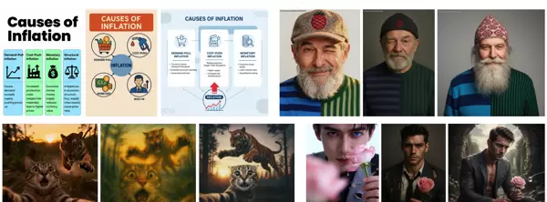Figure 4 Text-to-Image comparisons. Within each group, images are arranged from left to right as Seedream 4.0, GPT-Image-1, and Gemini-2.5. Prompt1: Draw an infographic illustrating the factors causing inflation.; Prompt2: A studio-style portrait of an elderly gentleman: he …, with his left eye firmly shut in a humorous and clever way… Prompt3: 狸花猫第一视角自拍,老虎在后面追,超现实主义,写实,黄昏背景; Prompt4: A dashing male model whose left eye iris is blue wears a tattered suit with a pink rose in his left hand; there is only a single dewdrop distinctly visible on the edge of the rose petal, seemingly about to drop from the petal to the ground in the following second.
