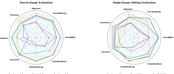 单一图像编辑的技术难点在于如何在执行用户命令的同时维持原始图像的核心特性。统一的流程设计使得编辑和生成功能可以共享基础的特征表示和学习机制,互相促进优化。指令遵守与一致性的平衡是该领域的基本挑战:过分强调指令遵守可能导致对原始图像的过度改动,而过于重视一致性则可能使模型难以精确执行复杂的编辑指令。不同模型在这一平衡上的倾向明显:GPT-Image-1 倾向于严格遵循指令但可能会破坏原始图像的一致性,Gemini-2.5 则更加注重保持原始特性但在复杂编辑任务上表现不佳。结构完整性评估模型是否能在编辑过程中保持图像的空间关系和几何结构,而文本编辑效能则测试模型对图像中文本内容的理解和处理能力。Seedream 4.0 通过均衡的设计在各个维度上均达到了较高的水平,具备较高的适用性和可靠性。