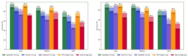 - Seedream 4.0 excels at the Easy and Medium levels, demonstrating robust generative responsiveness; however, its performance declines at the Hard level, particularly in single-image editing. This underscores the necessity for enhancing multi-modal comprehension and reasoning, an area that will benefit from scaling our models with pertinent data.