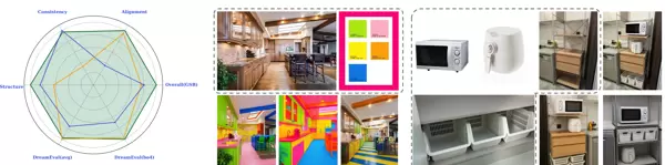 图6 多图像编辑比较。左:整体评估结果。右:两个示例,虚线框表示输入参考,输出从左至右展示为Seedream 4.0、GPT-Image-1和Gemini-2.5。在最右侧的示例中,右上方的图像源自Seedream 4.0。提示1:参照图二中的色彩表,将房间和所有家具转变为多巴胺风格。提示2:将图一中的物品置于柜子的上层架子上。将图二中的物品置于中间架子上。将图三中的物品置于柜子的下层架子上。