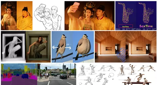 视觉信号,例如Canny边缘、素描、修复掩码或深度图,长期以来一直是可控生成的重要组成部分。它们使传递通常难以用语言表达的信息成为可能,如人体姿态或精确的空间布局,从而实现更精准和定向的生成。传统上,这种能力是利用多种专门模型(如ControlNet [9, 26])开发出来的。相反,Seedream 4.0原生地将这些功能整合到一个模型中。除了支持常见的视觉引导形式外,它还通过简单的线条或素描接纳创意输入,甚至可以实现由视觉信号驱动的新多图像组合。图10提供了示例。