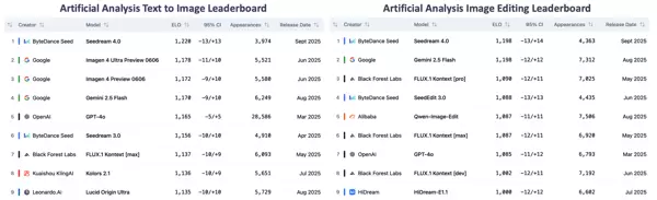 Figure 3 Results from the Artificial Analysis Arena: Seedream 4.0 leads in both the Text-to-Image and Image Editing tracks.