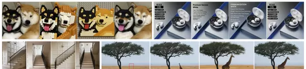 【翻译】图5 单图像编辑比较。在每组中,图像从左到右排列为原始图像、Seedream 4.0、GPT-Image-1和Gemini-2.5。提示1:将图中的两只狗改为乐高风格。提示2:将产品图像的文本翻译成英文。提示3:调整照片的视角,使其看起来像是直接面对楼梯拍摄的。提示4:在图中红框位置添加一只长颈鹿。