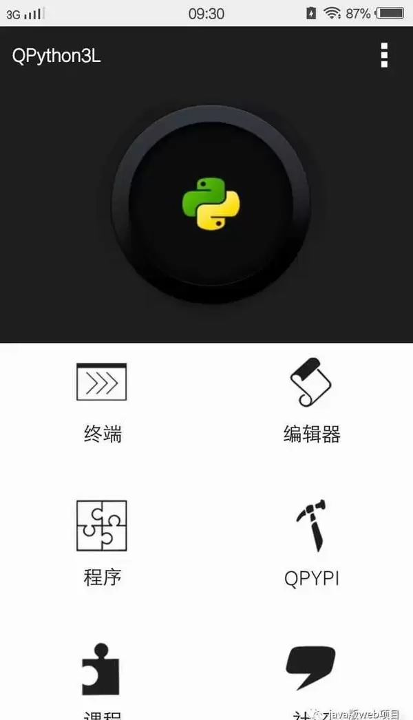 - 主界面如下,主要分为“终端”、“编辑器”、“程序”、“QPYPI”、“课程”、“社区”这六个模块,终端类似于IDLE,编辑器类似于记事本,QPYPI是第三方包和工具,程序存储官方自带的示例,课程是一些教学案例: