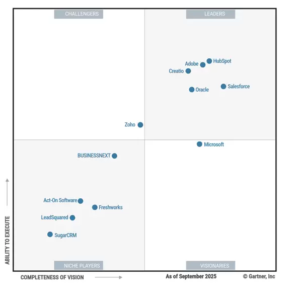 信息来源:Gartner,《B2B 营销自动化平台魔力象限》,作者:Rick LaFond、Jeffrey Cohen、Alan Antin、Upasna Chandna、Nicholas Mortensen,发布日期:2025 年 9 月 23 日。
