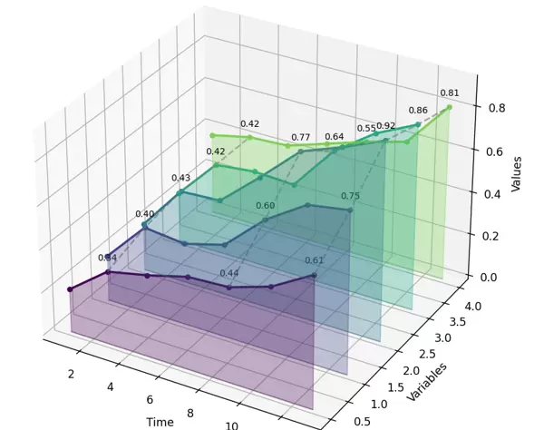 3D瀑布图通过三维展示解决了多变量时间序列数据的可视化挑战,它使得数据的时间趋势、变量对比、数值关系三个维度同时可见,尤其适合需要综合分析多个指标变化规律的场景。尽管制作比传统图表复杂,但在数据洞察深度上具有明显优势。