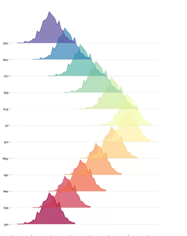 - 视觉层次:从红色渐变为紫色的色阶,使12 个月的分布在视觉上清晰分开,同时透明度的设定减少了 “山脉” 间的过度遮挡。