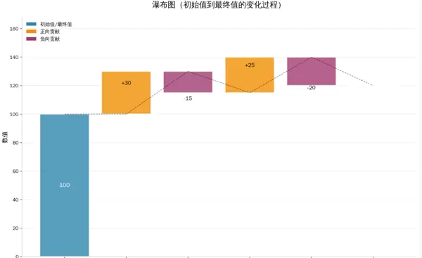 瀑布图源自财务管理领域,最初应用于财务分析,自20世纪90年代起在企业财务报告中广泛采用,其名称来源于图表形态类似瀑布的阶梯式变化。此图表以首根柱形条表示起始值,中间柱形条展示各项增减变化(正值表示增长、负值表示减少),最后一根柱形条呈现最终值,并通过色彩区分正负影响。瀑布图的主要优点在于能直观展示数据构成关系,清晰呈现从起点到终点的全过程及其各因素的贡献度;它能迅速识别关键驱动因素,明确显示正面与负面贡献者;通过将复杂数值关系可视化,有效减轻认知负担,便于向非技术人士解释数据;同时为根本原因分析和决策提供强有力的支持,帮助组织发现改进机会并进行情景比较。随着数据可视化工具的进步,瀑布图已从财务领域逐渐扩展至业务分析、项目管理等多个应用场景。