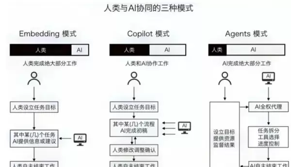 相比于嵌入模式和副驾模式,智能体模式显然更为高效,可能成为未来人机协作的主要方式。