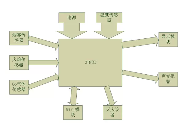 数据处理与报警阶段:每次采集到的数据都与设定的阈值进行对比。如果任何一个参数超过阈值,系统将触发报警,并控制灭火设备启动。