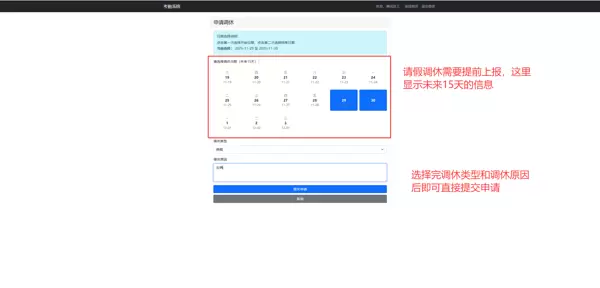 点击申请调休后,将进入如下界面,只需选择好调休日期和类型后点击提交: