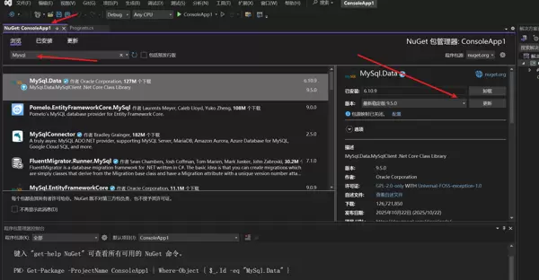 - 在浏览选项卡中搜索“Mysql.data”,选择适当的版本(例如6.10.9)进行安装。