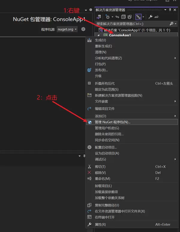 - 右键点击项目名称,选择“管理NuGet程序包”。