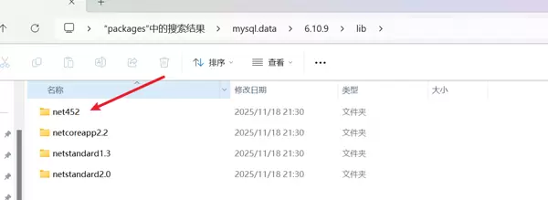 安装完成后,可以在路径C:\Users\你的用户名\.nuget\packages下找到相应的mysql文件夹。进入net452子文件夹中会看到Mysql.data.dll文件。