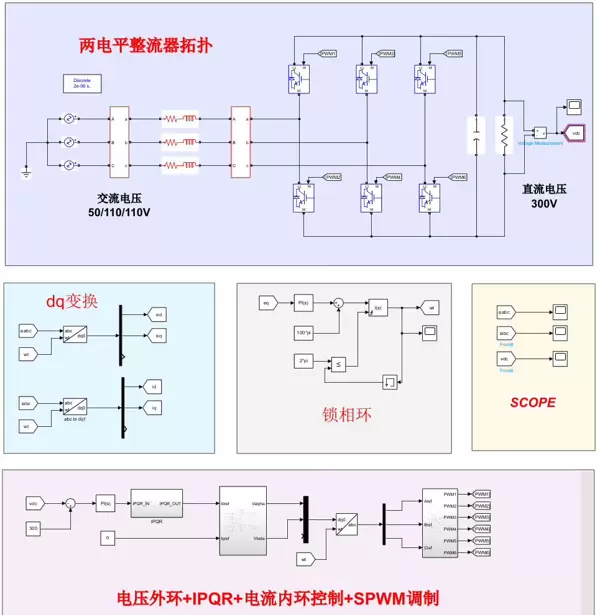 在Matlab中搭建整个不平衡电网整流器系统的仿真模型。可以利用Simulink来构建电路拓扑,将网侧电压源设置为幅值50/110/110V的三相不平衡电源,直流侧连接一个电压源来模拟300V的指令值。将上述编写的IPQR电流控制器模块接入到电流控制回路中。