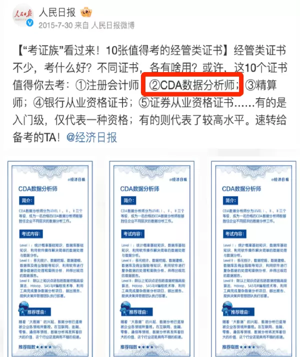 CDA数据分析师证书在数据领域享有极高的声誉,与注册会计师(CPA)、特许金融分析师(CFA)并列。该证书得到了《人民日报》、《经济日报》等权威媒体的推荐。