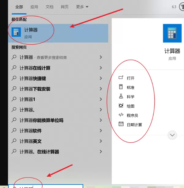- 输入“计算器”三个字,系统会自动显示最佳匹配结果,首个结果即为我们所需的应用程序。