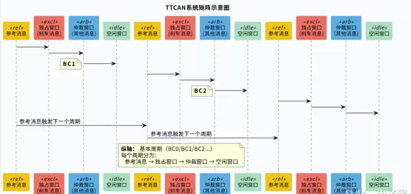 TTCAN可以看作是CAN的“高铁版”,通过参考消息和系统矩阵确保消息准时发送,适用于刹车、无人驾驶等硬核场景。其核心特点包括: