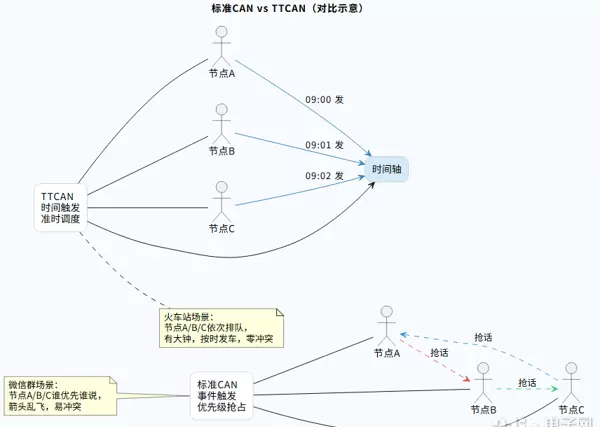 举例来说,TTCAN像高铁,准时且安全但成本较高;标准CAN像公交车,便宜灵活但在高峰期可能会拥挤。