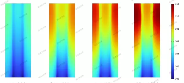 结合热源项\(Q\)的计算(\(Q\)通常与电池的化学反应热有关,这里假设已知\(Q = 1000 \, \text{W/m}^3\)),可以通过求解上述热传导方程获得温度分布。