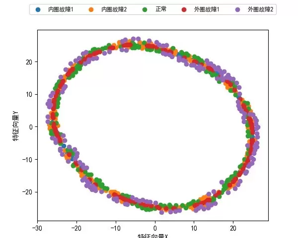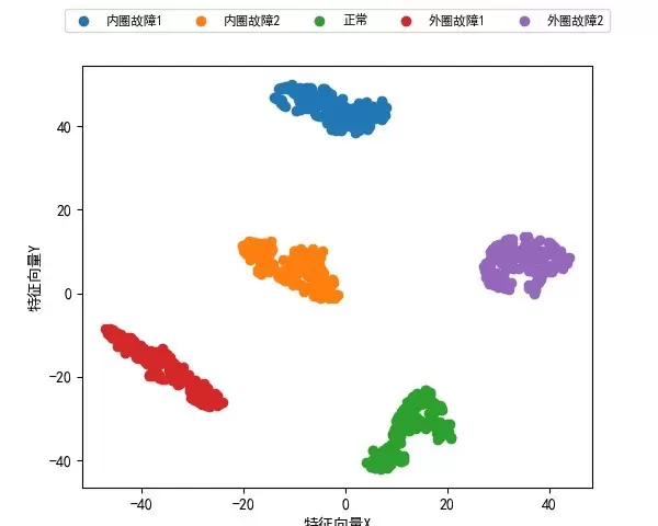 请注意,perplexity参数设置为15是经过网格搜索验证的最佳选择,过大的值可能导致类别边界模糊,过小则可能引起分布碎片化。实际运行结果呈现出类似彩色银河系的效果,不同故障类别清晰地聚集在一起。