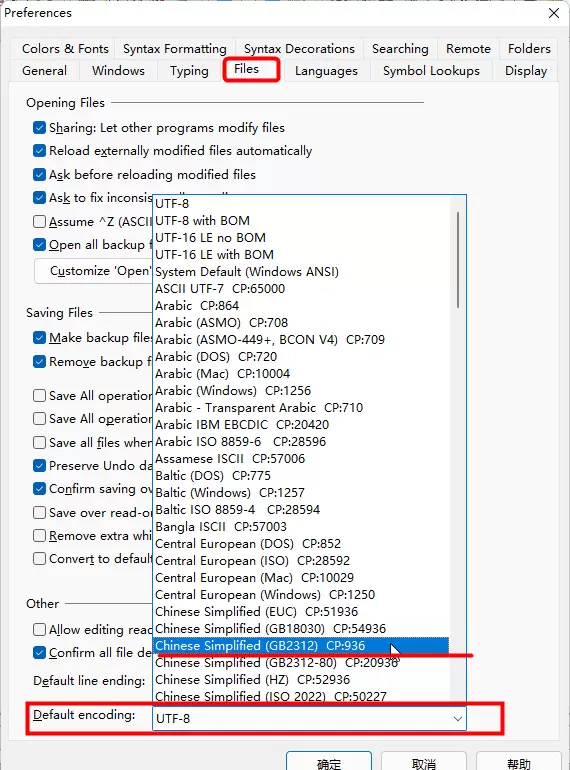 解决这一问题的方法是通过 SI4 菜单中的 “Options” -> “Preferences” -> “Files” 命令,进入设置界面后,在弹出窗口的底部将 Default Encoding 修改为你的源文件所使用的编码(通常是 GB2312)。具体操作如图所示: