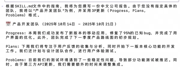 通过输入/internal-comms指令,可以为产品团队撰写本周的进展、计划和问题更新,重点突出新功能的发布和用户反馈。