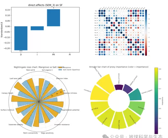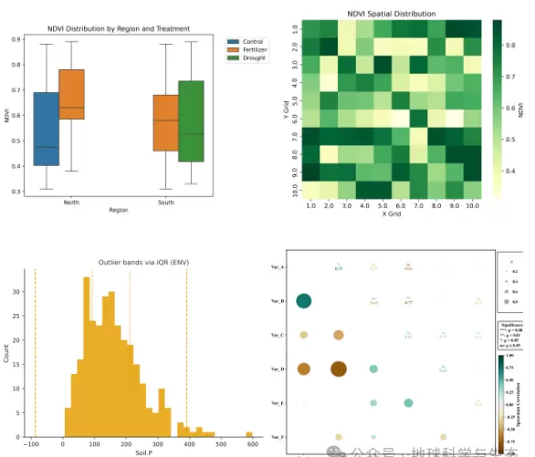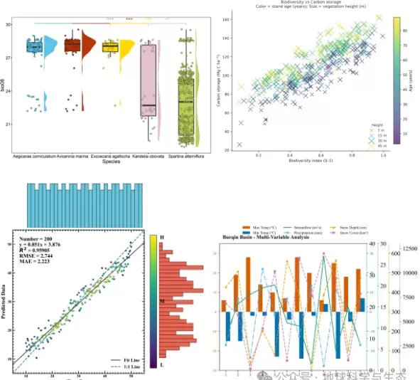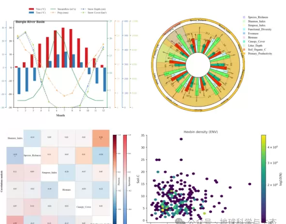 随着生态学与地学研究的深入发展,科研成果的可视化表达已成为学术交流与成果转化的重要组成部分。当前,不仅对图像的科学性和规范性提出了更高的要求(例如,SCI期刊对分辨率、色彩模式和矢量格式的严格标准),还需要通过高质量的图形来传达复杂的逻辑关系(如空间分布、多变量关联及机器学习模型的可解释性)。然而,许多研究人员面临着技术障碍:一方面,传统的绘图工具无法满足批量处理、个性化设计和跨平台兼容的需求;另一方面,虽然Python绘图生态系统(如Matplotlib、Seaborn、Cartopy等)功能强大,但由于缺乏针对生态与地学领域的系统培训,导致研究人员常因样式不统一、分辨率不足或空间数据叠加错误等问题而错失展示机会,甚至影响论文的发表效率。