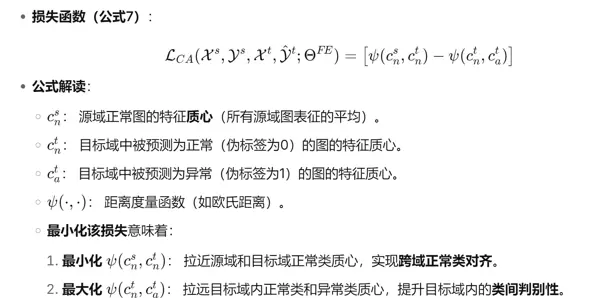 类别分类器旨在解决过渡对齐问题,即在实现域对齐的同时,确保目标域内的类别可分性。具体来说,分别计算源域正常类、目标域中被预测为正常类和被预测为异常类的特征向量的平均中心点。计算对齐损失,损失函数包括两项,前一项希望源域和目标域的正常类中心尽可能接近,后一项希望目标域内部的正常和异常类中心尽可能远离。这是一个动态过程,随着特征提取器和单类分类器的准确性提高,伪标签的可靠性也会提升,从而形成正向循环,改善类对齐效果。