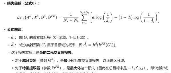 具体流程:特征提取器生成图的特征向量,输入到域分类器,域分类器输出一个概率值,表示该图来自目标域的可能性。使用二分类交叉熵损失函数计算损失,域分类器的目标是最小化损失,而特征提取器的目标是最大化损失,即生成让域分类器犯错的特征。通过这种对抗机制,特征提取器被迫学习与域无关的本质特征。
