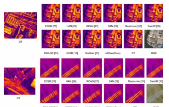 技术原理:针对无人机热成像数据分辨率低、细节不清晰的问题,提出了“多条件引导网络(MGNet)+多线索引导模块(MGM)”的深度学习框架。该方法使用高分辨率的可见光图像作为参照,通过MGNet学习跨模态特征映射,利用MGM加强热图像的边缘和纹理等细节,从而实现低分辨率热图像的毫米级精度提升。