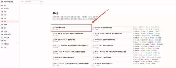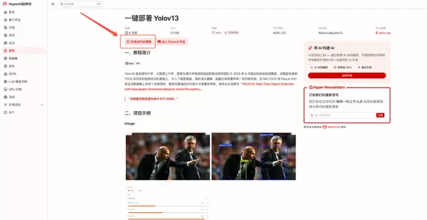 - 访问hyper.ai首页,选择“一键部署YOLOv13”或进入“教程”页面选择相应选项,点击“在线运行此教程”。