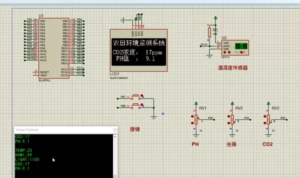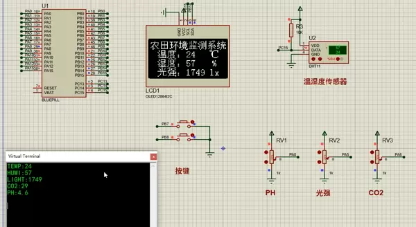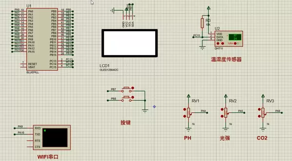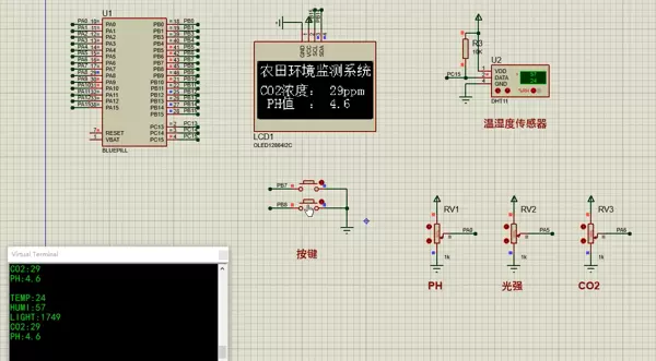 仿真设计主要包括STM32单片机、OLED显示屏、模拟pH值和光照强度的电位计、CO2电位计、温湿度传感器、独立按键以及模拟Wi-Fi模块的串行虚拟终端。